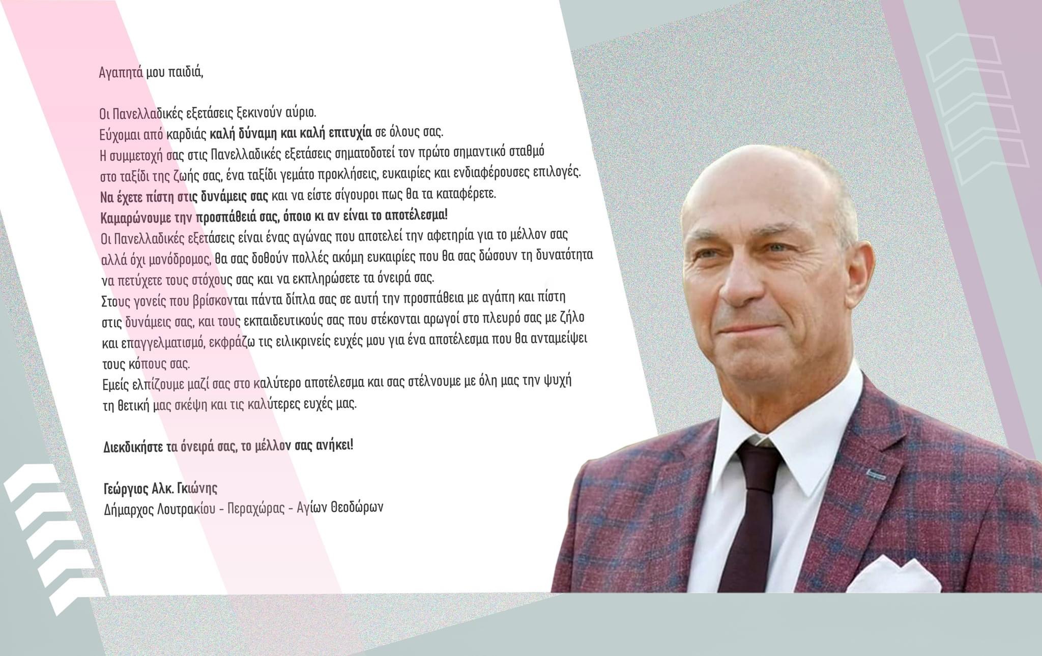 Μήνυμα Δημάρχου Δήμος Λουτρακίου – Περαχώρας – Αγίων Θεοδώρων κ. Γεώργιου Αλκ. Γκιώνη στις μαθήτριες και τους μαθητές που συμμετέχουν στις Πανελλαδικές Εξετάσεις