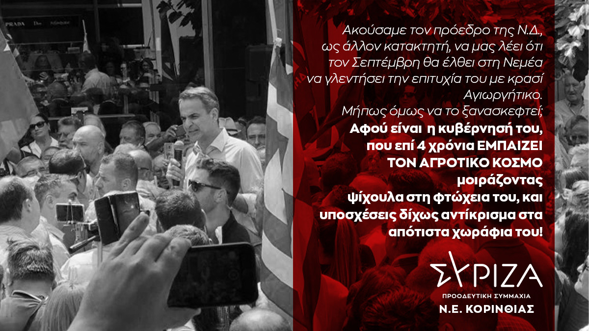 Τέλος, ακούσαμε τον πρόεδρο της Ν.Δ., ως άλλον κατακτητή, να μας λέει ότι τον Σεπτέμβρη θα έλθει στη Νεμέα να γλεντήσει την επιτυχία του με κρασί Αγιωργήτικο. Μήπως όμως να το ξανασκεφτεί, αφού είναι η κυβέρνησή του, που επί 4 χρόνια εμπαίζει τον αγροτικό κόσμο μοιράζοντας ψίχουλαστη φτώχεια του, και υποσχέσεις δίχως αντίκρισμα στα απότιστα χωράφια του!