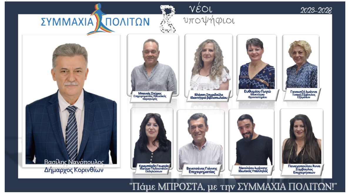 Σταθερά προσανατολισμένη στην ανανέωση των προσώπων αλλά και στην ενίσχυση του συνδυασμού της παρουσίας των γυναικών, η ΣΥΜΜΑΧΙΑ ΠΟΛΙΤΩΝ του δημάρχου Κορινθίων Βασίλη Νανόπουλου ανακοινώνει σήμερα 8 ακόμα υποψήφιους. Κορίνθιους ενεργούς που είδαν στα προηγούμενα 3,5 χρόνια την ικανότητα της δημοτικής αρχής όχι μόνο να παράξει σε δύσκολες συνθήκες έργο (απλή αναλογική, πανδημία, ενεργειακή κρίση) αλλά και να θέσει θεμέλια ανάπτυξης και οικονομικής ευημερίας επιτυγχάνοντας την χρηματοδότηση και εκτέλεση μεγάλων έργων. «Αφουγκραζόμαστε την ανάγκη των πολιτών για νέα πρόσωπα στην αυτοδιοίκηση, για νέα φιλοσοφία και σύγχρονη διοίκηση. Συνδυάζουμε την ανανέωση με την εμπειρία της ισχυρής ομάδας που σήμερα υπάρχει και δημιουργούμε εκείνη την παράταξη που με ασφάλεια θα οδηγήσει το δήμο Κορινθίων στο μέλλον» δήλωσε ο δήμαρχος Βασίλης Νανόπουλος.