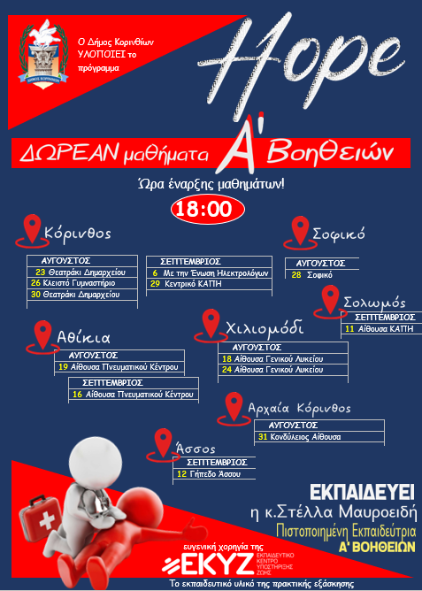 Συνεχίζονται τα ΔΩΡΕΑΝ 𝚺𝚬𝚳𝚰𝚴𝚨𝚸𝚰𝚨 𝚨΄ 𝚩𝚶𝚮𝚯𝚬𝚰𝛀𝚴 από τον δήμο Κορινθίων σε συνεργασία με την 𝚷𝚰𝚺𝚻𝚶𝚷𝚶𝚰𝚮𝚳𝚬𝚴𝚮 𝚬𝚱𝚷𝚨𝚰𝚫𝚬𝚼𝚻𝚸𝚰𝚨 κ.Στέλλα Μαυροειδή και με την σημαντική συμβολή του Εκπαιδευτικό Κέντρο Υποστήριξης Ζωής 𝚬𝚱𝚼𝚭 το οποίο παρέχει όλο το εκπαιδευτικό υλικό.