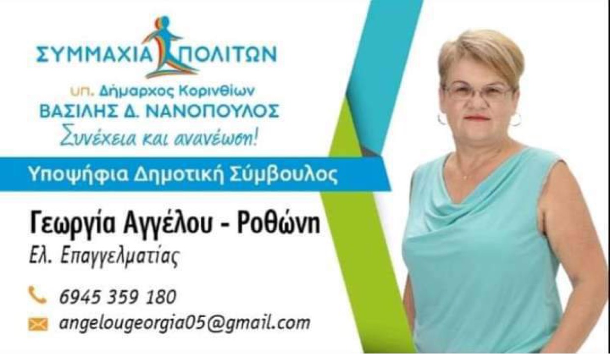 Η Γεωργία Αγγέλου Ροθώνη είναι επιχειρηματίας, ιδιοκτήτρια Στεγνοκαθαριστηρίου στα Λουτρά Ωραίας Ελένης. Διαμένει στα Εξαμίλια, η καταγωγή της όμως είναι από το Αγγελόκαστρο. Είναι παντρεμένη με τον Βασίλη Ροθώνη, έχει δυο παιδιά, τον Γιάννη και τον Άγγελο και τρία εγγόνια. Έχει διατελέσει στο παρελθόν μέλος του ΔΣ του συλλόγου Αγγελοκάστρου “Άγιος Παντελεήμονας” και η συμμετοχή της στο ψηφοδέλτιο της ΣΥΜΜΑΧΙΑΣ ΠΟΛΙΤΩΝ αποσκοπεί στην ενεργό δράση της προς όφελος του τόπου που ζει η ίδια και η οικογένεια της.