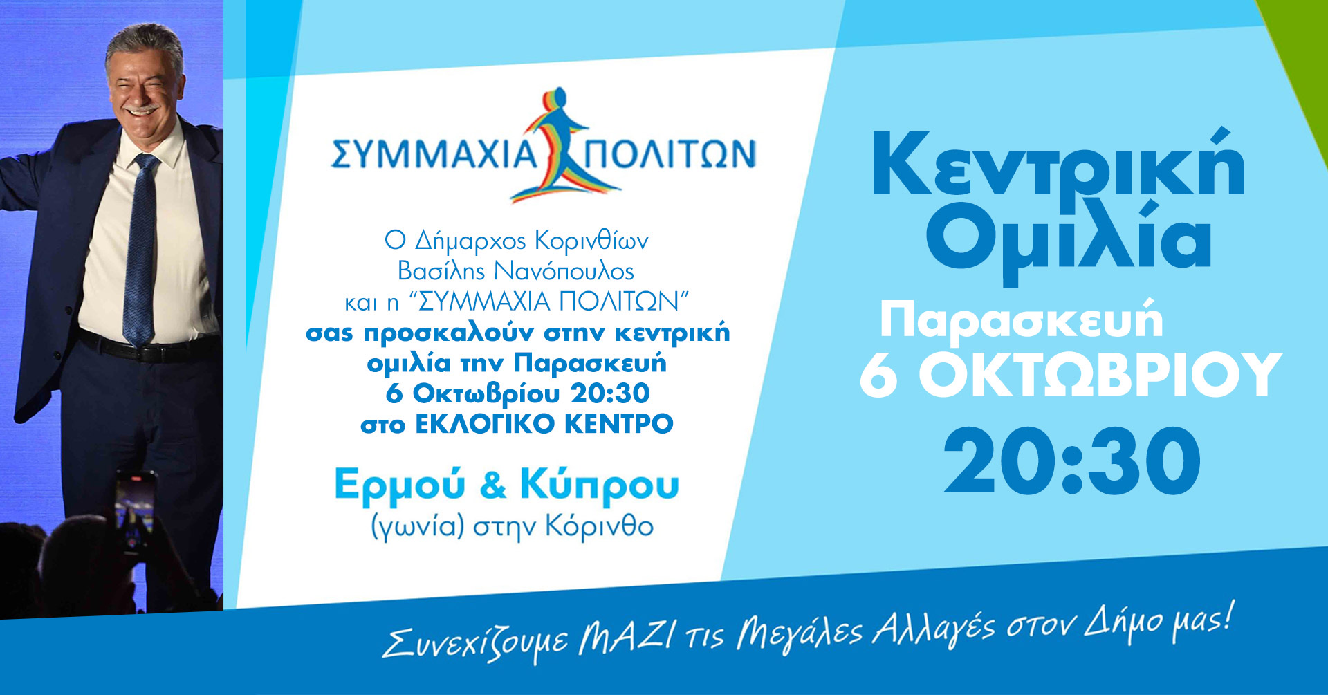 Ο Δήμαρχος Κορινθίων Βασίλης Νανόπουλος σας καλεί στην κεντρική προεκλογική του ομιλία, την Παρασκευή 6Οκτωβρίου 2023 και ώρα 20:30, έμπροσθεν του εκλογικού κέντρου της ΣΥΜΜΑΧΙΑΣ ΠΟΛΙΤΩΝ, Κύπρου και Ερμού γωνία στην Κόρινθο!