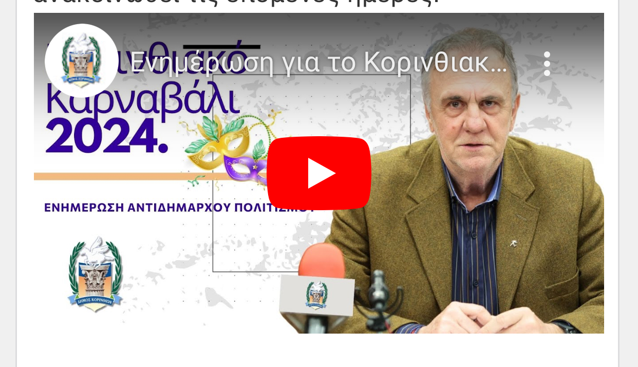 Συνέντευξη τύπου παρέθεσε σήμερα 21 Φεβρουαρίου 2024 ο Αντιδήμαρχος Πολιτισμού Παναγιώτης Λαμπρινός για τις εκδηλώσεις του Κορινθιακού Καρναβαλιού 2024. Ο Αντιδήμαρχος αφού ευχαρίστησε θερμά τους χορηγούς οι οποίοι συνέβαλλαν στο να πραγματοποιηθεί εντέλει το Κορινθιακό Καρναβάλι ανακοίνωσε πως οι αποκριάτικες εκδηλώσεις θα ξεκινήσουν την Κυριακή 25 Φεβρουαρίου 2024 στην πλατεία Παναγή Τσαλδάρη στην Κόρινθο. Ο Αντιδήμαρχος μεταξύ άλλων δήλωσε: