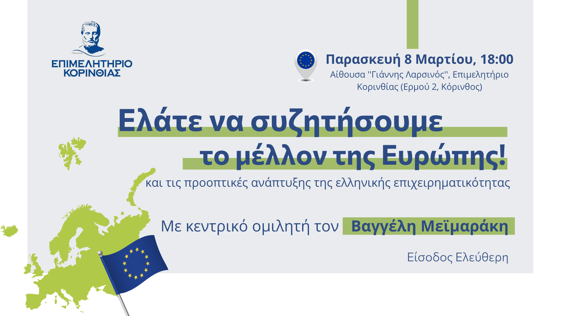 Το Επιμελητήριο Κορινθίας σας προσκαλεί σε εκδήλωση με θέμα ‘’Ελάτε να συζητήσουμε το μέλλον της Ευρώπης και τις προοπτικές ανάπτυξης της ελληνικής επιχειρηματικότητας’’ με κεντρικό ομιλητή τον Βαγγέλη Μεϊμαράκη, την Παρασκευή 8 Μαρτίου, στις 18:00 στο Αμφιθέατρο ‘’Γιάννης Λαρσινός’’, στο Επιμελητήριο Κορινθίας (Ερμού 2, Κόρινθος).