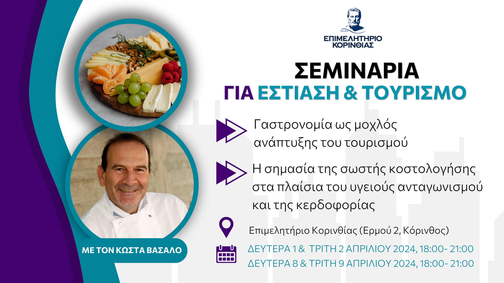 Το Επιμελητήριο Κορινθίας στο πλαίσιο της συνεχούς επιμόρφωσης και αναβάθμισης δεξιοτήτων των επιχειρήσεων – μελών του, διοργανώνει σε σεμινάρια προσανατολισμένα στην εστίαση και στον τουρισμό.