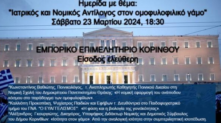 Το προσεχές Σάββατο 23-03-2024 και ώρα 18:30 θα πραγματοποιηθεί στην Κόρινθο μια πολύ ενδιαφέρουσα ημερίδα, την οποία διοργανώνουν η Δημοτική παράταξη του ΔΗΜΟΥ ΚΟΡΙΝΘΙΩΝ «ΠΟΛΙΤΙΚΗ ΔΙΕΞΟΔΟΣ» και η ΠΑΝΕΛΛΗΝΙΑ ΕΝΩΣΗ ΘΕΟΛΟΓΩΝ (Παράρτημα Ν. Κορινθίας). Αντικείμενο της ημερίδας είναι ο προβληματισμός και οι ενστάσεις που έχουν προκύψει από την πρόσφατη θέσπιση του γάμου ατόμων του ιδίου φύλου. Ο ομοφυλοφιλικός γάμος, παρά τις αντιδράσεις πλειοψηφίας των Ελλήνων, αποτελεί πια Νόμο του κράτους (Ν. 5089/16-2-2024) μετά από τις 176 θετικές ψήφους από βουλευτές των κομμάτων ΝΔ, ΣΥΡΙΖΑ, ΠΑΣΟΚ-ΚΙΝΑΛ, Νέα Αριστερά και Πλεύση Ελευθερίας.