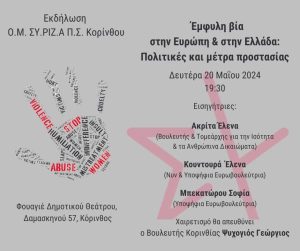 Διανύουμε μία εποχή όπου οι γυναικοκτονίες αποτελούν σχεδόν καθημερινή είδηση στα ΜΜΕ με την κυβέρνηση να κωφεύει στις κραυγές αγωνίας της κοινωνίας. Στο πλαίσιο αυτής της στρεβλής κανονικότητας ηΟργάνωση Μελών ΣΥ.ΡΙΖ.Α – ΠΣ Κορίνθου διοργανώνει εκδήλωση την Δευτέρα 20 Μαΐου στις 19.30, στο Φουαγιέ Δημοτικού Θεάτρου Κορίνθου (Δαμασκηνού 57).