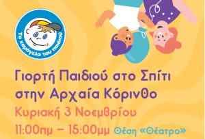 «Το Χαμόγελο του Παιδιού» με χαρά σας προσκαλεί στη Γιορτή για τα Παιδιά που διοργανώνει στο Σπίτι στην Αρχαία Κόρινθο, Θέση «Θέατρο», τηΚυριακή 3 Νοεμβρίου από τις 11:00 έως τις 15:00 για να διασκεδάσουμε όλοι μαζί μικροί και μεγάλοι.