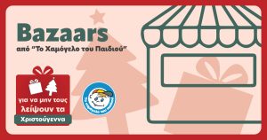 Για να μη λείψουν τα Χριστούγεννα σε κανένα παιδί… «Το Χαμόγελο του Παιδιού» σας προσκαλεί και φέτος στα Χριστουγεννιάτικα Bazaars που διοργανώνει ανά την Ελλάδα, ώστε να υποστηρίξουμε τα παιδιά που φιλοξενούνται στα Σπίτια του Οργανισμού πανελλαδικά, τα παιδιά που υποστηρίζονται στα Σπίτια Ημερήσιας Φροντίδας του Οργανισμού και τα παιδιά, που οι οικογένειές τους αντιμετωπίζουν προβλήματα διαβίωσης και αδυνατούν να καλύψουν ακόμα και τις βασικότερες ανάγκες των παιδιών τους (υλικές, ιατρικές, εκπαιδευτικές κ.λπ.)
