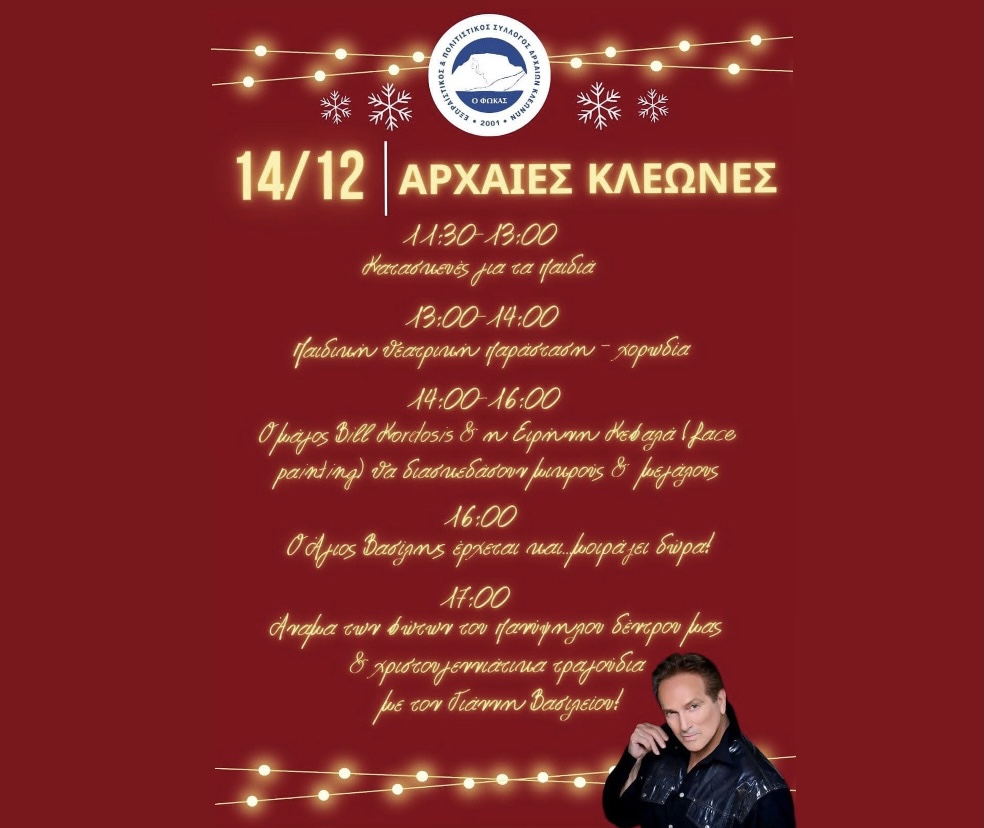 Ο Πολιτιστικός Σύλλογος Αρχαίων Κλεωνών σας καλεί στο άναμμα του Χριστουγεννιάτικου δέντρου στην κεντρική πλατεία του χωριού