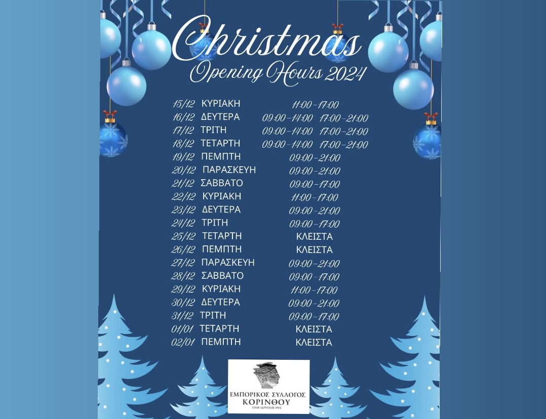 Το προτεινόμενο εορταστικό ωράριο λειτουργίας των καταστημάτων από τον Εμπορικό Σύλλογο Κορίνθου ξεκινάει από την Κυριακή 15 Δεκεμβρίου 2024.