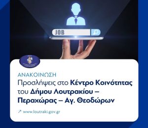 Ο Δήμος Λουτρακίου – Περαχώρας – Αγίων Θεοδώρων ανακοινώνει την πρόσληψη, με σύμβαση εργασίας ιδιωτικού δικαίου ορισμένου χρόνου, συνολικά τριών (3) ατόμων, για την υλοποίηση του Υποέργου 1, της Πράξης «Συγκρότηση και Λειτουργία Κέντρου Κοινότητας στο Δήμο Λουτρακίου – Περαχώρας – Αγ.Θεοδώρων», που εδρεύει στο Λουτράκι, της Περιφερειακής Ενότητας Κορινθίας.