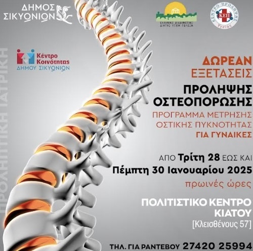 Ο Δήμος Σικυωνίων, σε συνεργασία με το Ελληνικό Διαδημοτικό Δίκτυο Υγιών Πόλεων (ΕΔΔΥΠΠΥ), το ΚΕΠ Υγείας και το Κέντρο Κοινότητας του Δήμου, διοργανώνει Πρόγραμμα Μέτρησης Οστικής Πυκνότητας για γυναίκες, με στόχο την πρόληψη της οστεοπόρωσης.