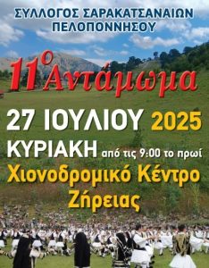 Το Χιονοδρομικό Κέντρο Ζήρειας ετοιμάζεται να φιλοξενήσει, για ακόμη μια χρονιά, το Αντάμωμα Σαρακατσαναίων, που θα πραγματοποιηθεί την Κυριακή 27 Ιουλίου 2025. Πρόκειται για έναν θεσμό που τιμά τις ρίζες και την πολιτιστική κληρονομιά των Σαρακατσαναίων, φέρνοντας κοντά ανθρώπους κάθε ηλικίας σε μια γιορτή γεμάτη μνήμες, μουσικές και παραδόσεις.