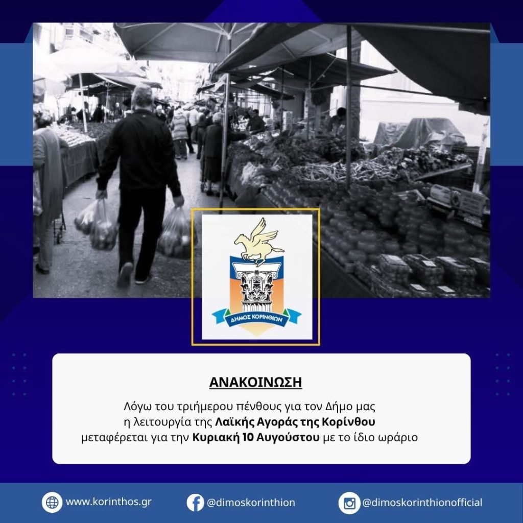 Ο Δήμος Κορινθίων ενημερώνει ότι η λαϊκή αγορά Κορίνθου δεν θα λειτουργήσει το Σάββατο 9 Αυγούστου 2025, λόγω συμμετοχής του Δήμου στο τριήμερο πένθος για την εκδημία του μακαριστού Μητροπολίτου κυρού Διονυσίου Δ΄.