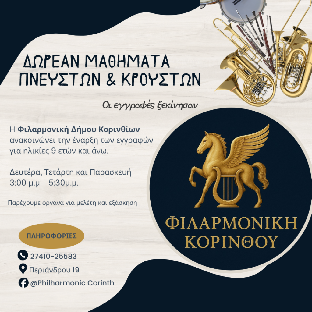 Ο Δήμος Κορινθίων, στο πλαίσιο της πολιτιστικής του προσφοράς και με στόχο την καλλιέργεια της μουσικής παιδείας στις νεότερες γενιές, ανακοινώνει την έναρξη των δωρεάν μαθημάτων πνευστών και κρουστών οργάνων της Φιλαρμονικής Δήμου Κορινθίων.
