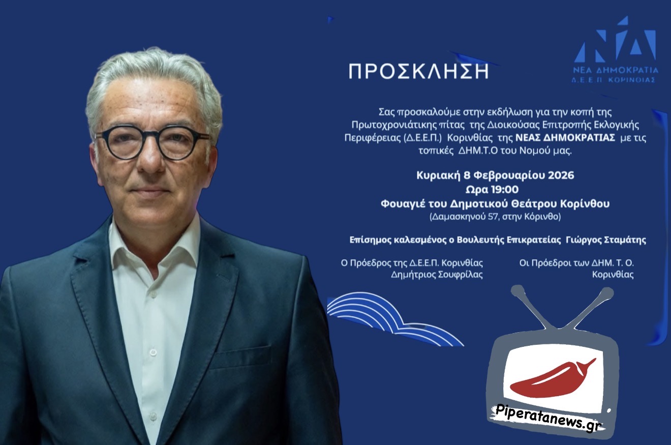 Σας προσκαλούμε στην εκδήλωση για την κοπή της Πρωτοχρονιάτικης πίτας της Διοικούσας Επιτροπής Εκλογικής Περιφέρειας (Δ.Ε.Ε.Π.) Κορινθίας της Νέας Δημοκρατίας, με τη συμμετοχή των τοπικών ΔΗΜ.Τ.Ο. του Νομού μας.