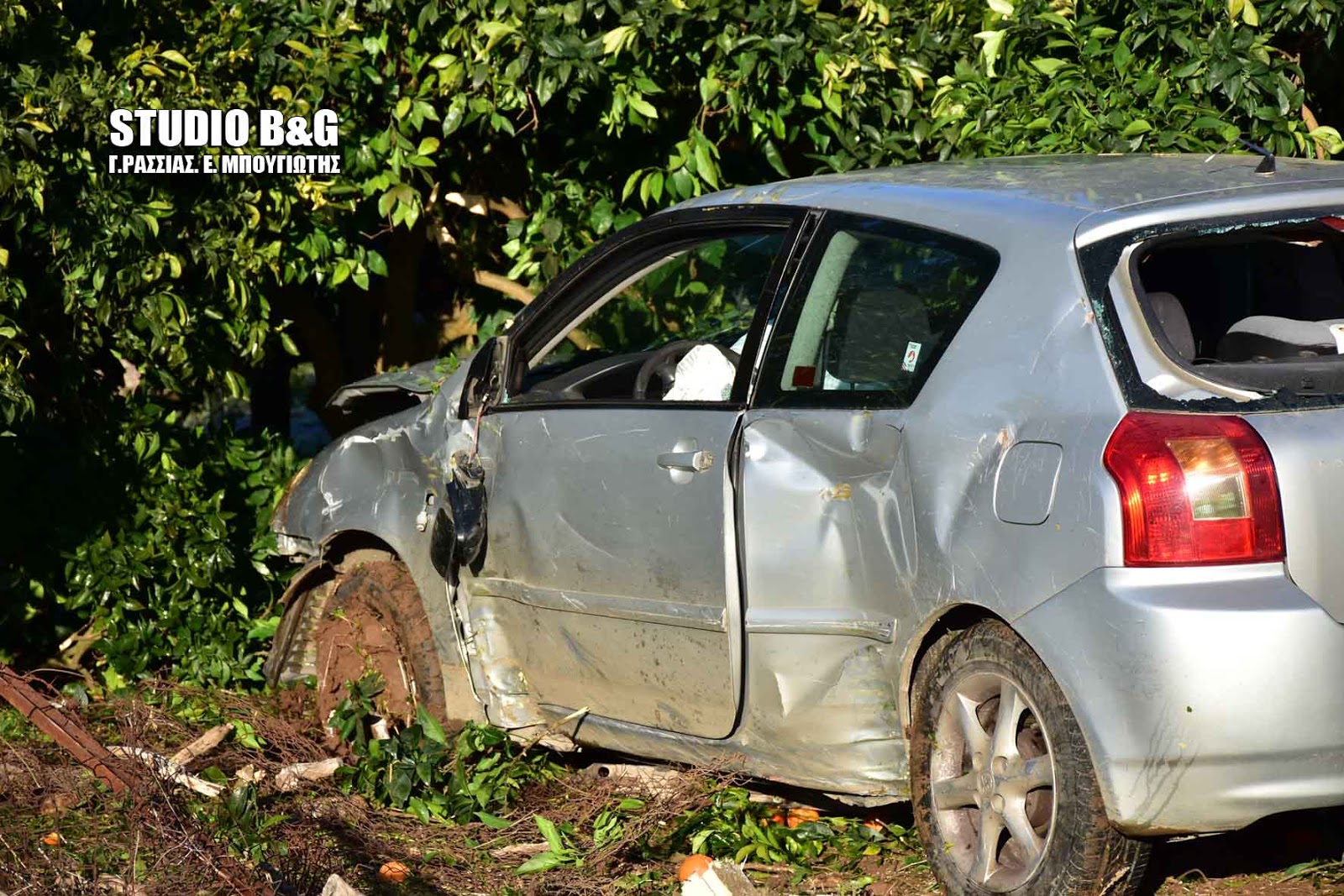 Το αυτοκίνητο εξετράπη της πορείας του και κατέληξε σε χωράφι με πορτοκαλιές , κόβοντας μάλιστα δυο από αυτές και σταμάτησε σε μια τρίτη.