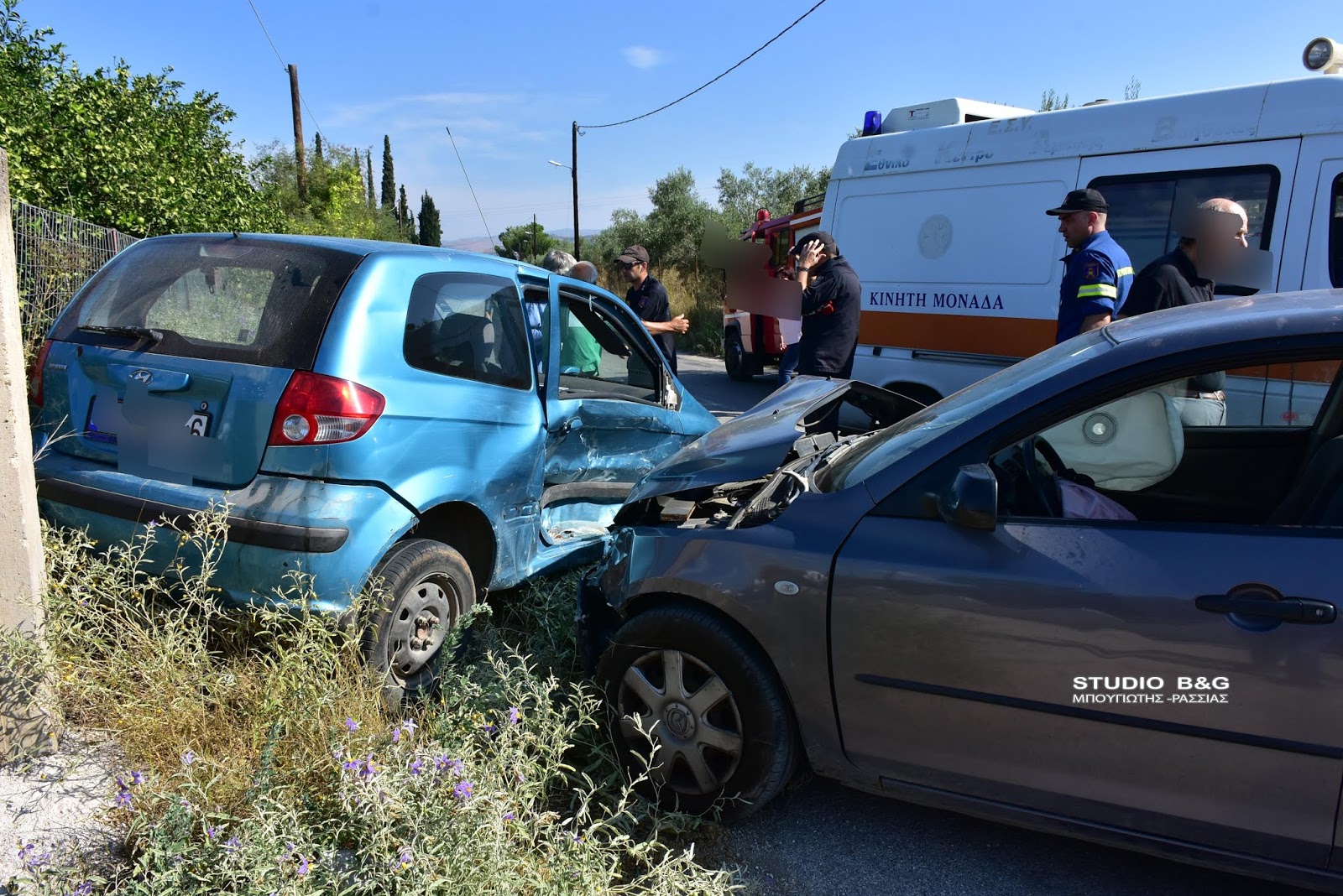 Στο σημείο έσπευσαν οχήματα και άνδρες της Πυροσβεστικής η αστυνομία και το ΕΚΑΒ που παρέλαβαν δυο ελαφριά τραυματίες.