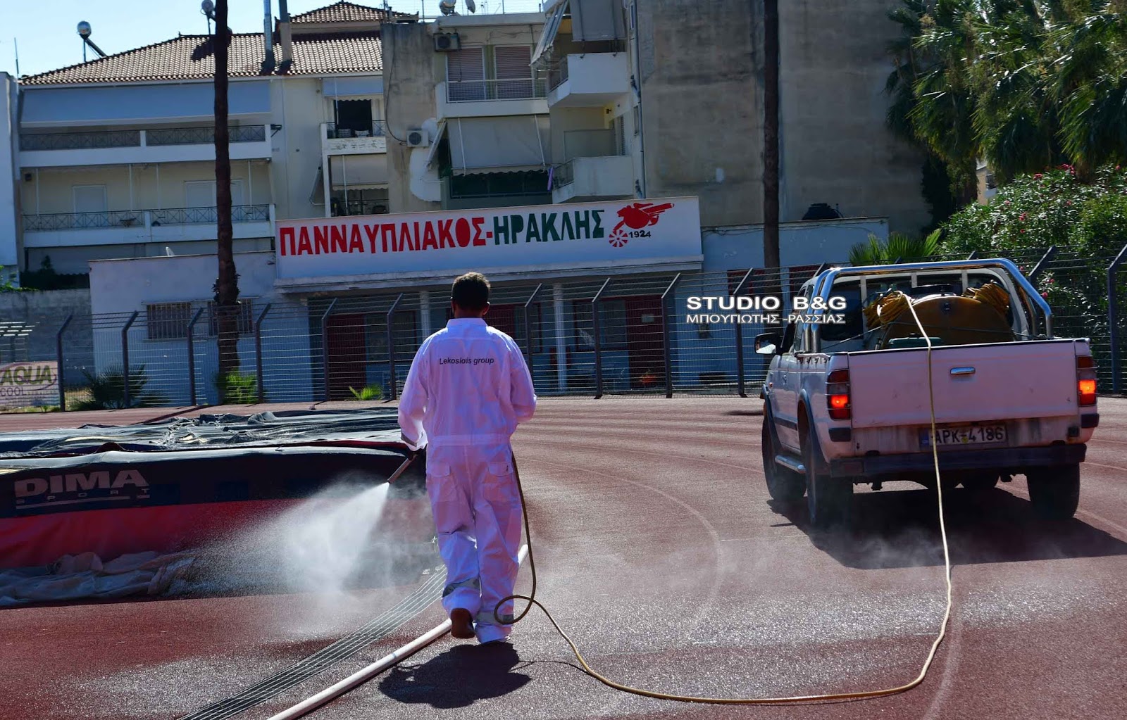Συνεργείο εκτελεί απολύμανση στους χώρους του Δημοτικού Σταδίου στην πόλη του Ναυπλίου μετά από θετικό κρούσμα στην ομάδα του Παναυπλιακού , Δευτέρα 10 Αυγούστου 2020. Μετά τον εντοπισμό πιστοποιημένου κρούσματος κορονοιού COVID 19 σε μέλος της ομάδας του Παναυπλιακού ο Δήμος Ναυπλιέων και ο ΔΟΠΠΑΤ τηρώντας με αυστηρότητα όλα τα προβλεπόμενα μέτρα για την αποτροπή διασποράς του κορονοιού έκλεισε τις εγκαταστάσεις του Δημοτικού Αθλητικό Κέντρο Ναυπλίου για τη διενέργεια απολυμάνσεων σε όλους τους ανοικτούς και κλειστούς χώρους του σταδίου .Επίσης όλοι οι υπάλληλοι του Δημοτικού Οργανισμού οι οποίοι εργάζονται στο Δ. Α. Κ. Ν. υποβλήθηκαν σε τεστ στο νοσοκομείο Ναυπλίου.