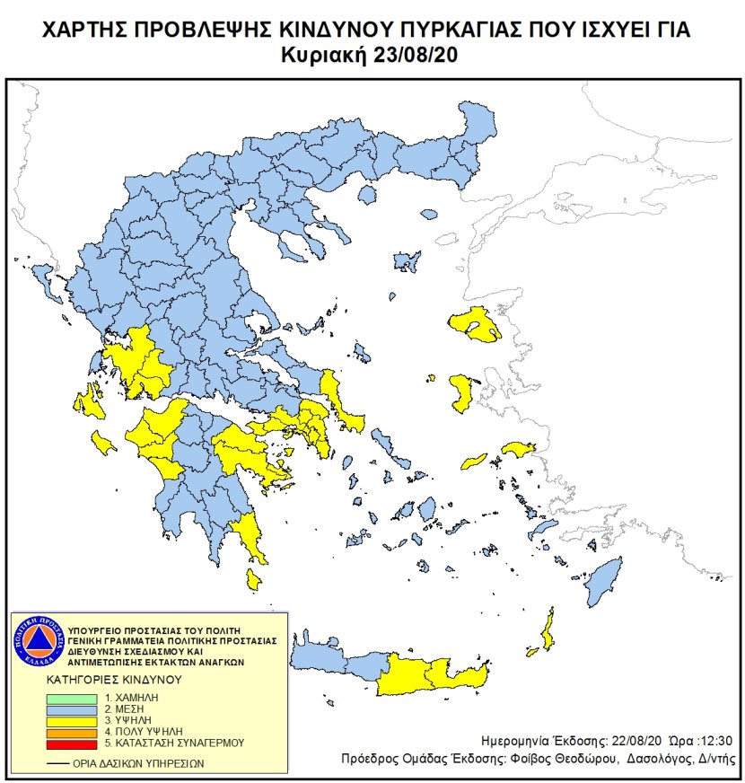 Σύμφωνα με το Χάρτη Πρόβλεψης Κινδύνου Πυρκαγιάς που εκδίδει η Γενική Γραμματεία Πολιτικής Προστασίας, για την Κυριακή 23 Αυγούστου 2020, προβλέπεται υψηλός κίνδυνος πυρκαγιάς (κατηγορία κινδύνου 3) σε: Αττική, Ν.Εύβοια, Κορινθία, Αργολίδα, Λακωνία, Κύθηρα, Ηλεία, Αχαΐα, Αιτωλοακαρνανία, Ζάκυνθο, Κεφαλλονιά, Λέσβο, Χίο, Σάμο, Ικαρία, Κάρπαθο, Λασίθι και Ηράκλειο.