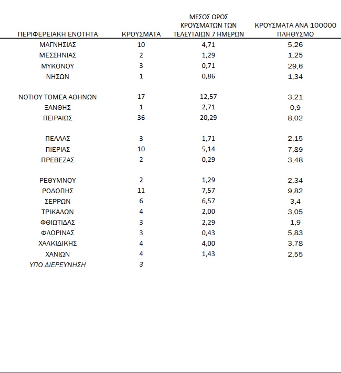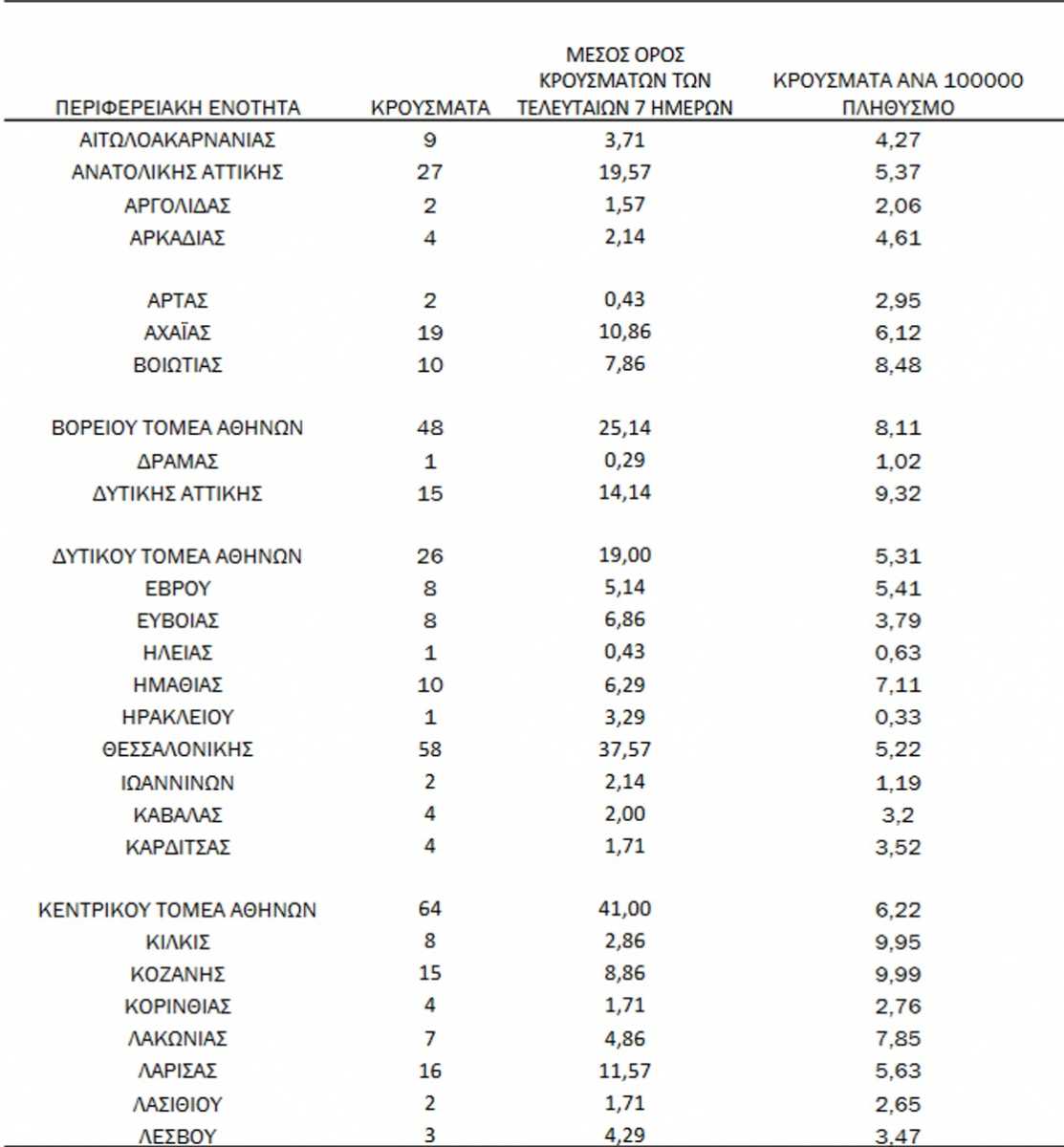 Δείτε αναλυτικά τους πίνακες με την κατανομή των κρουσμάτων ανά περιφέρεια: