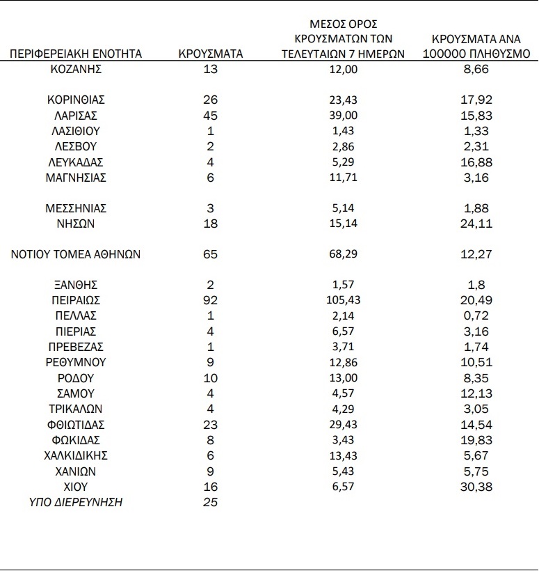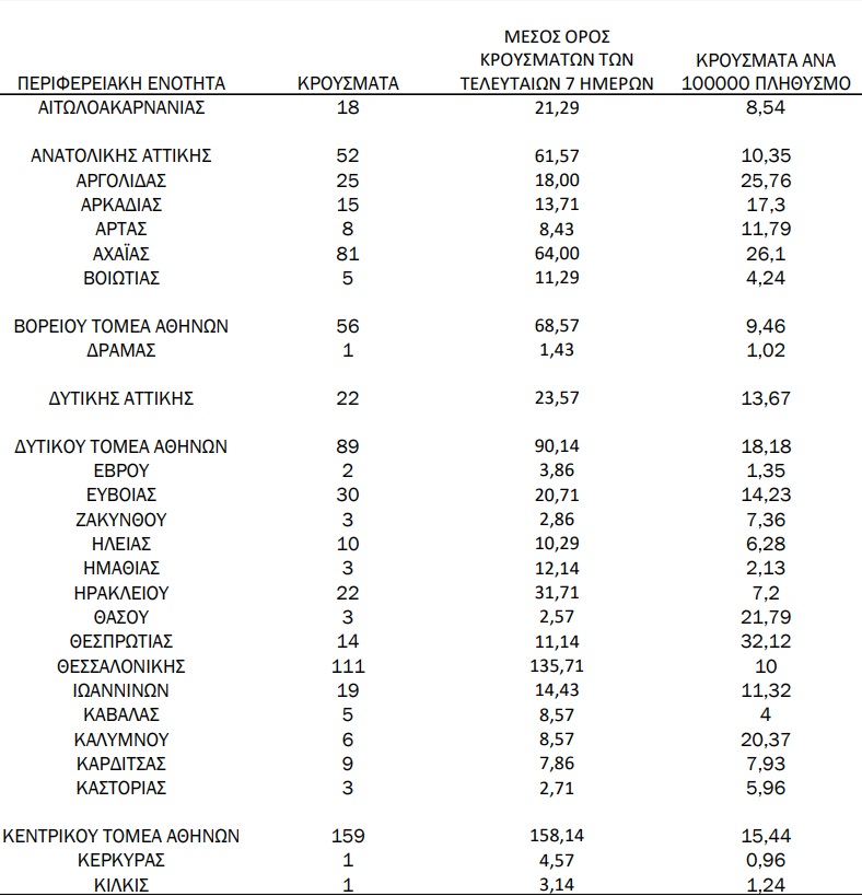 Είναι ενδεικτικό ότι 15 περιφέρειες καταγράφουν διψήφιο αριθμό κρουσμάτων.