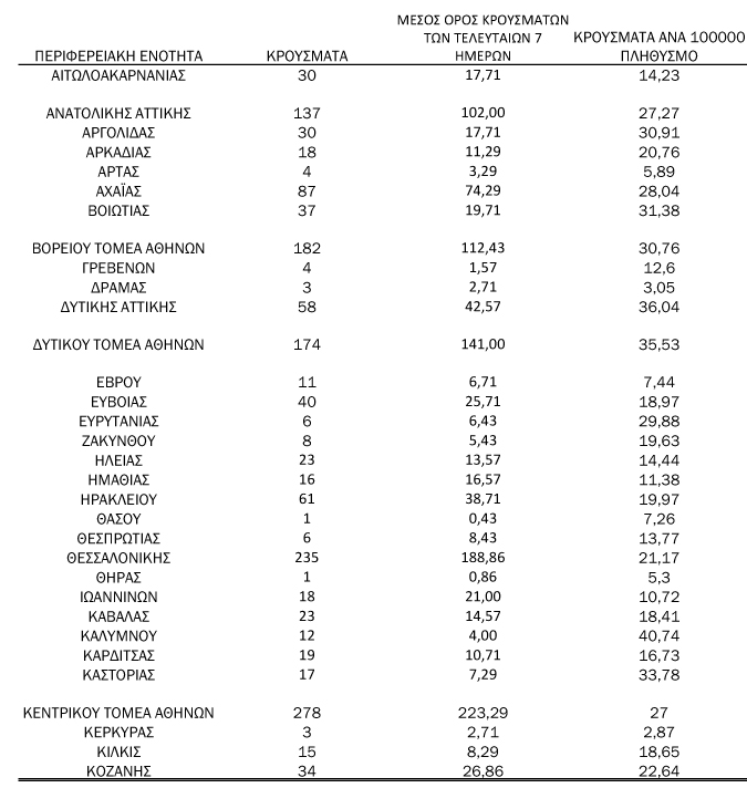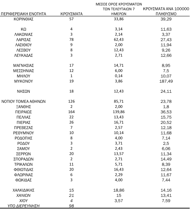 Οι νέοι θάνατοι ασθενών με COVID-19 είναι 49, ενώ από την έναρξη της επιδημίας έχουν καταγραφεί συνολικά 6.986 θάνατοι. Το 95.8% είχε υποκείμενο νόσημα ή/και ηλικία 70 ετών και άνω.