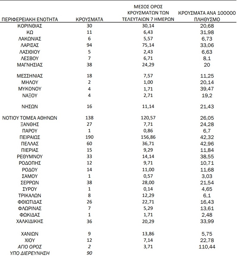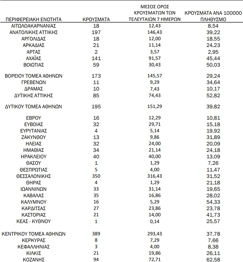 Δείτε αναλυτικά την κατανομή των κρουσμάτων, σύμφωνα με τα στοιχεία που έδωσε στη δημοσιότητα ο ΕΟΔΥ: