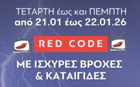 Σύμφωνα με την υπ’ αρ. πρωτ. Α194/20-01-2026 (ΑΔΑ: 6ΤΥ246ΝΠΙΘ-8Τ0) Απόφαση του Γενικού Γραμματέα Πολιτικής Προστασίας και λαμβάνοντας υπόψη τα Δελτία Πρόγνωσης Καιρού της Ε.Μ.Υ., η Περιφέρεια Πελοποννήσου και ο Δήμος Λουτρακίου – Περαχώρας – Αγίων Θεοδώρων, τίθενται σε κατάσταση κινητοποίησης (Red Code) από αύριο, Τετάρτη 21.01.2026 έως και την Πέμπτη 22.01.2026, καθώς προβλέπονται ισχυρές βροχές […]