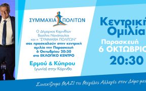 Ο Δήμαρχος Κορινθίων Βασίλης Νανόπουλος σας καλεί στην κεντρική προεκλογική του ομιλία, την Παρασκευή 6Οκτωβρίου 2023 και ώρα 20:30, έμπροσθεν του εκλογικού κέντρου της ΣΥΜΜΑΧΙΑΣ ΠΟΛΙΤΩΝ, Κύπρου και Ερμού γωνία στην Κόρινθο! ΣΥΝΕΧΙΖΟΥΜΕ ΜΑΖΙ τις μεγάλες αλλαγές για τον δήμο μας!
