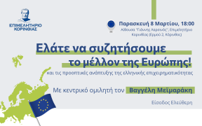 Το Επιμελητήριο Κορινθίας σας προσκαλεί σε εκδήλωση με θέμα ‘’Ελάτε να συζητήσουμε το μέλλον της Ευρώπης και τις προοπτικές ανάπτυξης της ελληνικής επιχειρηματικότητας’’ με κεντρικό ομιλητή τον Βαγγέλη Μεϊμαράκη, την Παρασκευή 8 Μαρτίου, στις 18:00 στο Αμφιθέατρο ‘’Γιάννης Λαρσινός’’, στο Επιμελητήριο Κορινθίας (Ερμού 2, Κόρινθος). ________________________________________