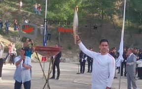 Ο αρχηγός της Εθνικής ομάδας ποδοσφαίρου Τάσος Μπακασέτας ανάβει το βωμό με την Ολυμπιακή Φλόγα στο κατάμεστο Αρχαίο Στάδιο της Νεμέας. https://www.facebook.com/share/v/xrPwf5gxoKRpAzF5/?mibextid=WC7FNe