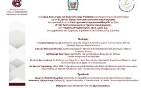 Την Τετάρτη 28 Φεβρουαρίου 2024 στις 18:00 μ.μ. στο Αμφιθέατρο του Τμήματος Κοινωνικής και Εκπαιδευτικής Πολιτικής, Δαμασκηνού και Κολοκοτρώνη στην Κόρινθο, θα πραγματοποιηθεί Επιστημονική – Ενημερωτική Ημερίδα με θέμα «Υγεία Γαστρεντερικού Συστήματος και Διατροφή». Η ημερίδα συνδιοργανώνεται από το Τμήμα Κοινωνικής και Εκπαιδευτικής Πολιτικής του Πανεπιστημίου Πελοποννήσου και το Ελληνικό Ίδρυμα Γαστρεντερολογίας και Διατροφής και […]