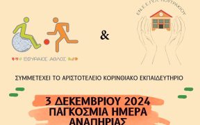 Την Τρίτη 3 Δεκεμβρίου , ο Εφυραίος Άθλος και το ΕΝ.Ε.Ε.ΓΥ.Λ. Λουτρακίου με αφορμή την Παγκόσμια Ημέρα Αναπηρίας, διοργανώνουν εκδήλωση με μουσικοκινητικές δραστηριότητες (ρυθμική, aerobic, χορό , κινητικά παιχνίδια) με την συμμετοχή των μαθητών του Αριστοτέλειου Κορινθιακού Εκπαιδευτηρίου. Χώρος διεξαγωγής δράσης Κλειστό Γυμναστήριο Γ.Γαλανόπουλος, Λουτράκι Ώρα έναρξης 9:30