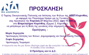 Με αφορμή την Παγκόσμια Ημέρα για τις Γυναίκες, οΤομέας Οικογενειακής Πολιτικής και Ισότητας τωνΦύλων της ΔΕΕΠ Κορινθίας, τιμάει το γυναικείο φύλοδιοργανώνοντας ημερίδα με θέμα: ” Η θέση της γυναίκας στη σημερινή κοινωνία”. Κυριακή 27 Μαρτίου 2022 ώρα 11:00 το πρωί στοΕπιμελητήριο Κορινθίας. Ομιλήτριες: Μαρία Συρεγγέλα Υφυπουργός Ισότητας των Φύλων, Δημογραφικής &Οικογενειακής Πολιτικής Σοφία Ζαχαράκη Υφυπουργός […]