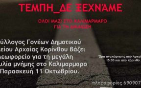 Ο σύλλογος γονέων του δημοτικού σχολείου Αρχαίας Κορίνθου βάζει λεωφορείο για την μεγάλη συναυλία μνήμης στο Καλλιμάρμαρο την Παρασκευή 11, Οκτωβρίου. Επικοινωνήστε άμεσα για να κατοχυρώσετε την θέση σας.