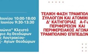 Η τελική φάση Τραμπολίνο συλλόγων, ατομικού Δ Κατηγορίας και Α, Γ, Δ Περιφερειών, καθώς και ο περιφερειακός αγώνας τραμπολίνο, επιπέδων 1-4, Α, Γ, Δ, Περιφερειών θα γίνει στους Αγίους Θεοδώρους Κορινθίας. Οι αγώνες θα διεξαχθούν 8 και 9 Ιουνίου 2024. Θα ξεκινήσουν στις 10 το πρωί του Σαββάτου και θα ολοκληρωθούν, το απόγευμα. Την Κυριακή, 9 του […]